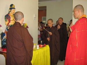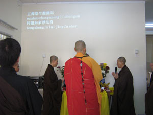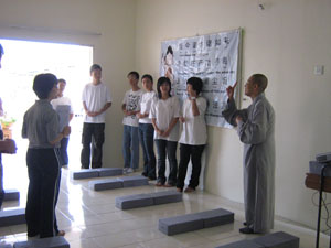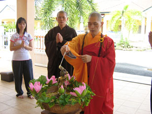 两位中学老师带领七位中学生在一大清早怀着欢喜的心来当义工,维持秩序,真信师父亲切地为他们讲解当义工的意义与心态。安排工作岗位后,我们做了两次的彩排, 以便浴佛法会能够顺利地进行。