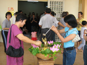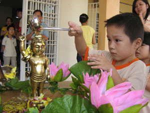 法会开始时,大家在法师及护法的带领下唱诵《炉香赞》、《心经》和《赞佛偈》,然后大家在唱诵《浴佛偈》中循序列队到大殿前浴佛。除了让小菩萨及爱心老师们浴佛,也有许多家长们出席参与, 其中还有印裔同胞。大家在声声浴佛偈中,学习将心安定,在沐浴太子像当儿,学习将心洗涤。