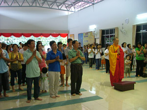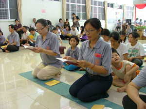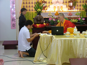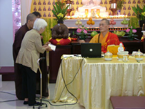 中午十二时半,传授三皈五戒的仪式在真如法师的主持下开始了。师父先向佛友开示三皈五戒的内涵及其利益,再进行传授仪式。仪式过后,在慧本法师的宣念皈依者的法名,受了三皈五戒的佛友们真诚地跪着向真如法师领取三皈五戒证书。过后大众随着师父一起念,仪式就此圆满结束了。