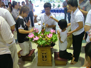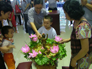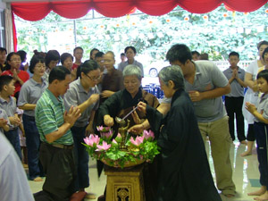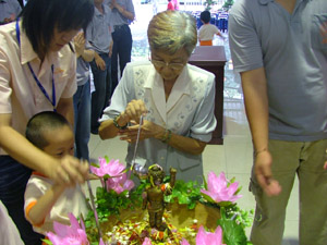 佛法开示过后,就到了庆典最高潮的时刻——浴佛法会。一手指天,一手指地的悉达多太子圣像立在浴佛盆中间,盆里是布满花瓣的香汤,盆子边缘布满了莲花,盆子下放了三个拜垫。“我今灌沐诸如来, 净智庄严功德海……”,由慧本法师与慧念法师带领大众唱诵,众佛友们欢喜地列队浴佛。大家虔诚地跪下,用勺子舀取香汤为悉达多太子圣像沐浴。第一勺,愿断一切恶;第二勺,愿修一切善;第三勺,誓度一切众生。整个浴佛的仪式由于有了佛法的灌注而充满意义。