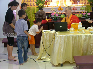 早上九时半许多佛友们陆续扶老携幼前来檀香净苑。有些佛友到缘捐处点福慧灯或买供品做十供养,小菩萨们则欢天喜地的让爱心老师在小手上绑七色线,有的佛友则到大殿后的长廊处观赏《寻找.佛教的足迹——布秧河谷》展览。
