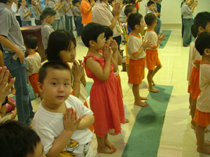师父的三个提问都得到幼儿园的小菩萨和佛学班的同学们的集体回应,他们也得到师父的夸奖。