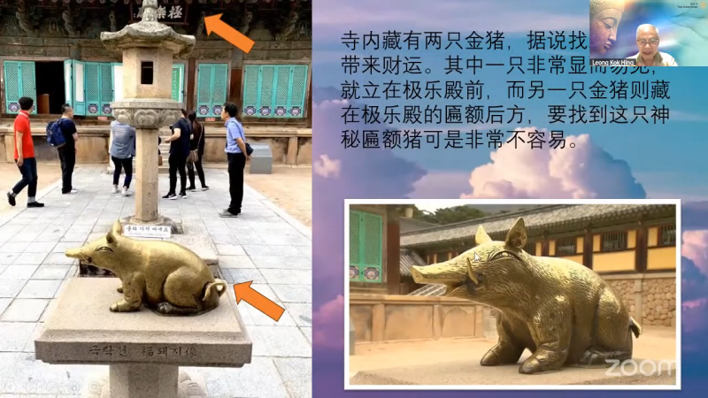 寺内藏有两只金猪,据说找到会带来财运。其中一只非常显而易见,就立在极乐殿前,而另一只金猪则藏在极乐殿的匾额后方,要找到这只神秘匾额猪可是非常不容易。