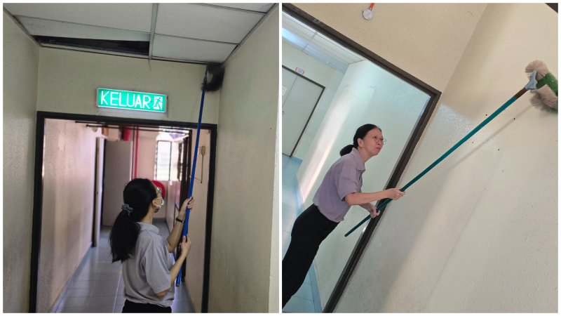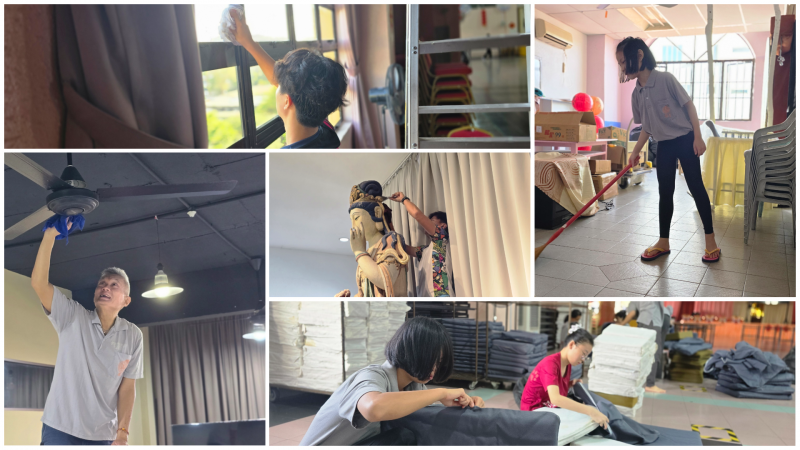 在短短几小时内,大家齐心协力清扫每个角落、窗户、桌椅和拜垫,使环境焕然一新、整洁舒适。在打扫过程中,住持真升法师还亲自到各楼层分发面包和矿泉水,温暖了大家的心。