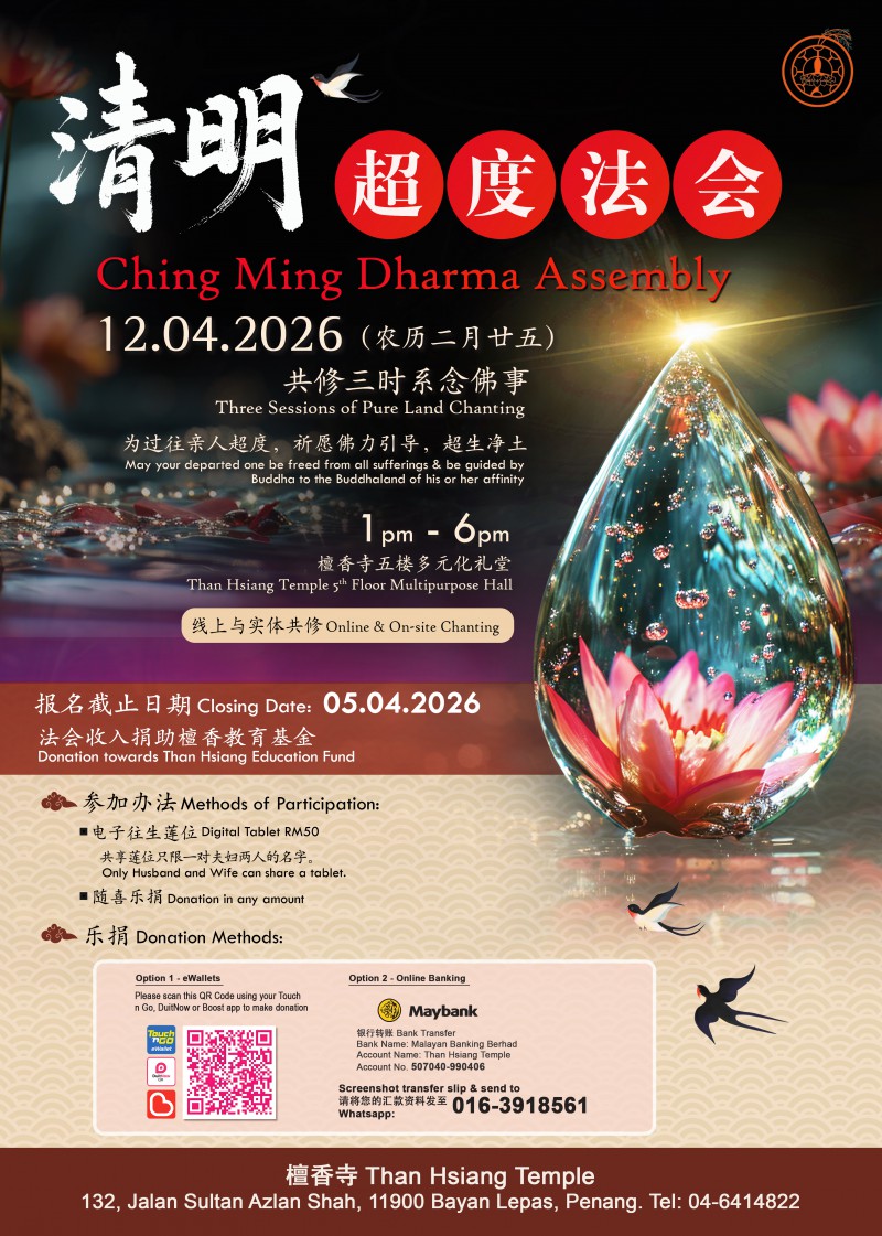 檀香寺将于12-04-2026, 星期日 (农历二月廿五),下午一时至六时于檀香寺5楼多元化礼堂启建清明法会, 共修《中峰国师三时系念佛事》一堂,集此功德,内资法会净土坛上各姓门中历代考妣宗亲及各人之累劫冤亲债主;外拔十方法界一切无祀男女孤魂等众,祈愿佛力接引,超生净土。