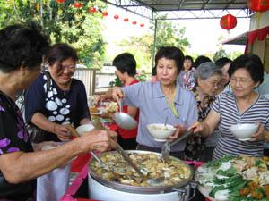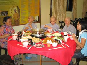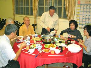 这场虽然简单但又充满温馨的岁末团圆晚宴于当晚6点半正式开始。大众在新年歌声陪伴下, 快乐地享用热腾腾的美味素食火锅佳肴。