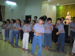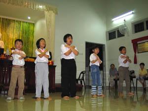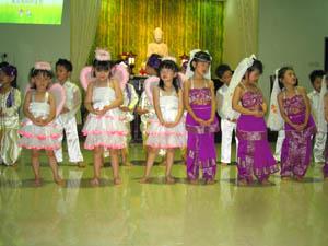 首先,周五佛学班的同学们热情地唱出〈欢迎歌〉以示欢迎大家的到来;接着是〈谢谢你〉, 至诚感谢诸位护法大德这一路来的支持。打扮得万分可爱的幼儿园小菩萨们, 稚气地舞动着MOMO欢乐舞与印度舞, 逗得法师们、贵宾们及大众乐开怀 。安亲班的小朋友们也以其童真的手语方式来表达〈快乐一家亲〉。
