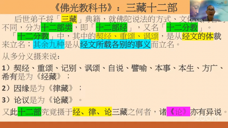 《佛光教科书》提到,三藏十二部是后世弟子将「三藏」典籍,就佛陀说法的方式、文体及内容的不同,分为十二部类,即「十二部经」,又名「十二分教」。