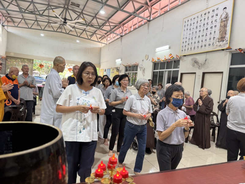 司仪发言结束后,聚会进入了庄严的献灯环节。法师们带领大家来到佛前,进行献灯仪式。随后,郑琇至师姐带领大家念诵十善法及发愿。