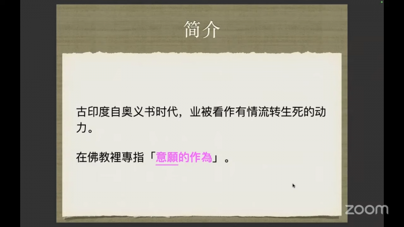 因此,远古印度甚至在奥义书时代对「业」已经这样子的一个应用的话,佛陀在大概2500多年前的那一个时代,承自印度的这一种文化,将 karma或 kamma带到佛教的说法里面,就把它标为跟身心有关的,名为「意愿的作为」。