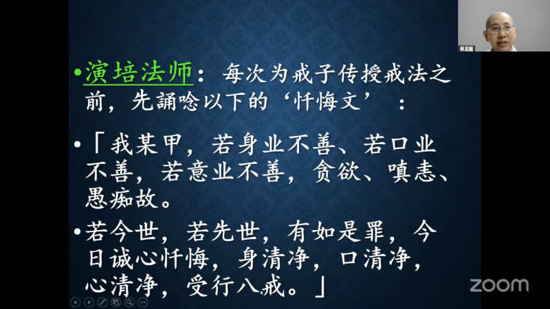 演培法师每次为戒子传授戒法之前,先誦唸以下的「忏悔文」 :「我某甲,若身业不善、若口业不善,若意业不善,贪欲、嗔恚、愚痴故。若今世,若先世,有如是罪,今日诚心忏悔,身清净,口清净,心清净,受行八戒。」