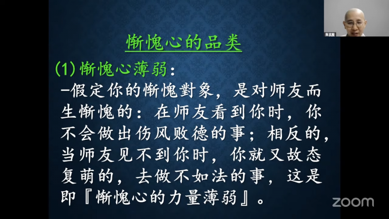 -假定你的惭愧對象,是对师友而生惭愧的:在师友看到你时,你不会做出伤风败德的事;相反的,当师友见不到你时,你就又故态复萌的,去做不如法的事,这即是『惭愧心的力量薄弱』。