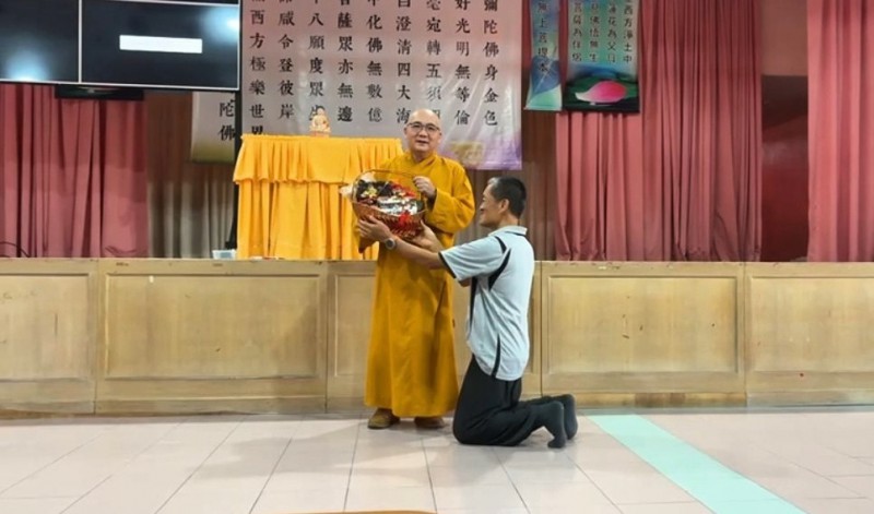 随后,梁子露师兄向真胜法师敬献一份供养礼篮,以表达我们对法师精彩佛法开示的诚挚感恩。