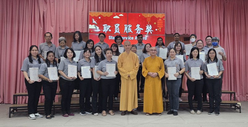 下一个环节是职员服务奖。由住持真升法师颁发给服务十五年以下的檀香寺职员,而开山唯悟法师则颁发给服务十五年以上的檀香寺职员,以感恩他们的默默付出。同时,两位司仪特别提到最后一位获得服务奖的职员——林青澌居士。她在檀香兢兢业业地服务了33年,用33年的岁月积极参与并见证了檀香一次又一次的突破与成长。