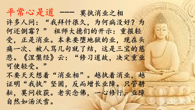 不要天天想着「消业相」。越执着消业,越证明「我执」坚固,反而增长业障。只管耕耘,莫问收获。老实念佛,一心修行,业障自然如汤沃雪。(就好像热汤倒在雪里面,慢慢地,雪就开始很快地融化;就是默默地耕耘就好,一直在做好的东西,不要求什么收获,老实地念佛,一心修行,做好我们自己的本分。)