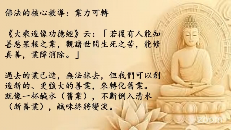 过去的业已造,无法抹去,但我们可以创造新的、更强大的善业,来转化旧业。就像一杯咸水(旧业),不断倒入清水(新善业),咸味终将变淡。