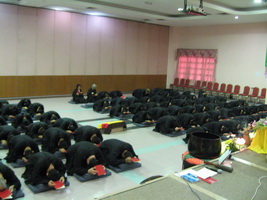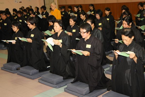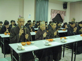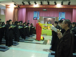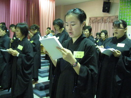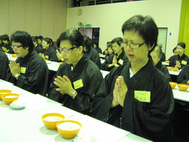 Retreat participants checked in to the temple from 12 noon to 3 p.m. on May 31st. At 3 p.m. Venerable Zhen Xin gave a briefing on rules and regulations to the participants. After the briefing, Venerable Zhen Ti explained the basic procedures after which the participants had their one and only dinner throughout the retreat. They were to skip dinner for the following two days because they would be observing the Eight Precepts. A Cleansing Ceremony was held at 7 p.m. followed by a discourse on Buddhist Ethics given by Venerable Zhen Ru.