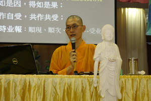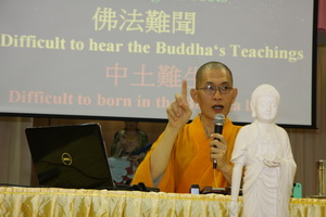 On the following evening Venerable Zhen Ru delivered a discourse on the stages of spiritual path and how they are connected to the Buddha Name Recitation practice. In the Shared Initial Stage a practitioner learns to avoid unwholesome deeds and cultivate wholesome deeds. Their aim is to gain a favourable rebirth in future lives. One recites Amitabha Buddha's name with the intention of getting a rebirth in Sukhavati, the Pure Land of Amitabha Buddha. In the Shared Intermediate Stage the practitioner's aspiration is to liberate oneself from Samsara, the cycle of birth and death. In the Exclusive Advanced Stage one not only strives for own emancipation from Samsara but also vows to attain Buddhahood so as to help sentient beings free themselves from sufferings. The Buddha Name Recitation practitioner will vow to return to Samsara to help suffering sentient beings after attaining enlightenment in Sukhavati.