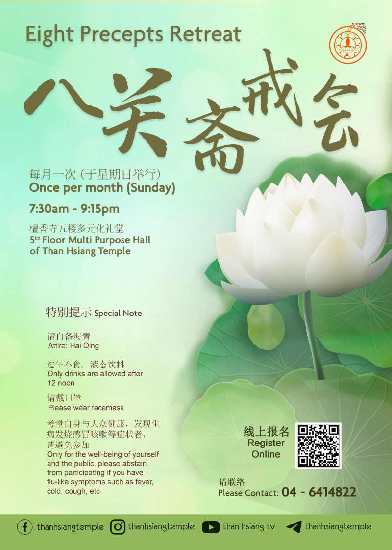 Once per month (Sunday), the Eight Precepts Retreat is held at the Multi-Purpose Hall on the 5 th Level of Than Hsiang Temple. While the cultivation is a one-day programme, the Eight Precepts have to be taken for twenty-four hours.
