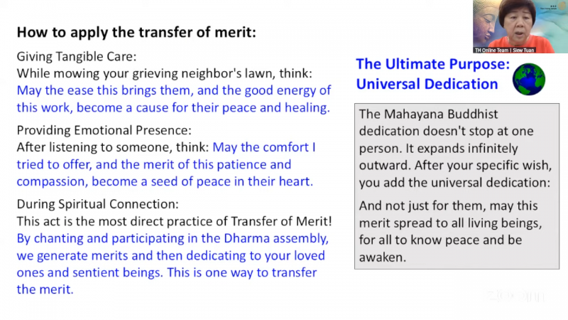 This act is the most direct practice of Transfer of Merit! By chanting and participating in the Dharma assembly, we generate merits and then dedicating to your loved ones and sentient beings. This is one way to transfer the merit.