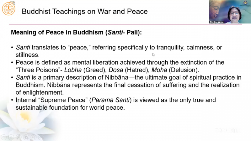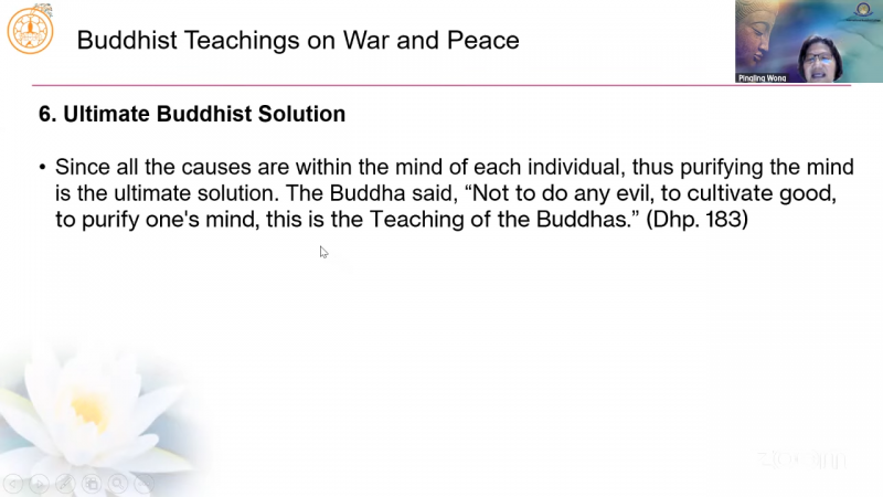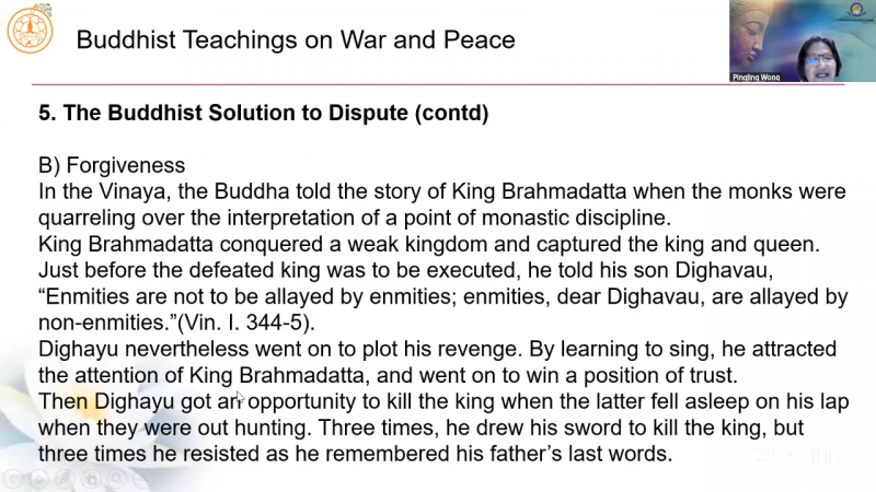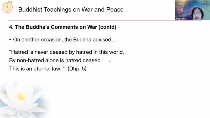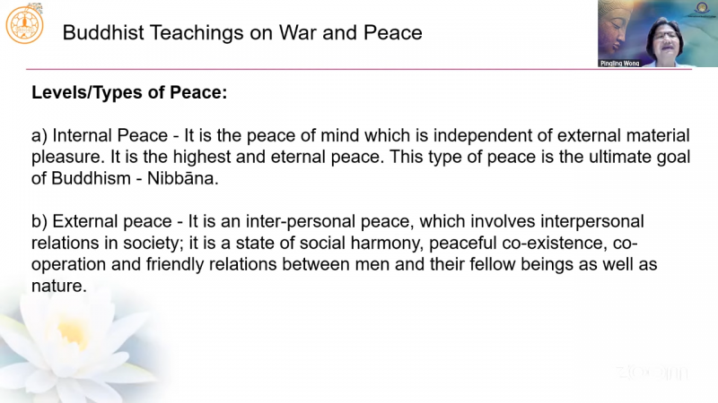 Teaching Assistant of International Buddhist College, Sis Wong Ping Ling shared on " Buddhist Teachings on War and Peace ".