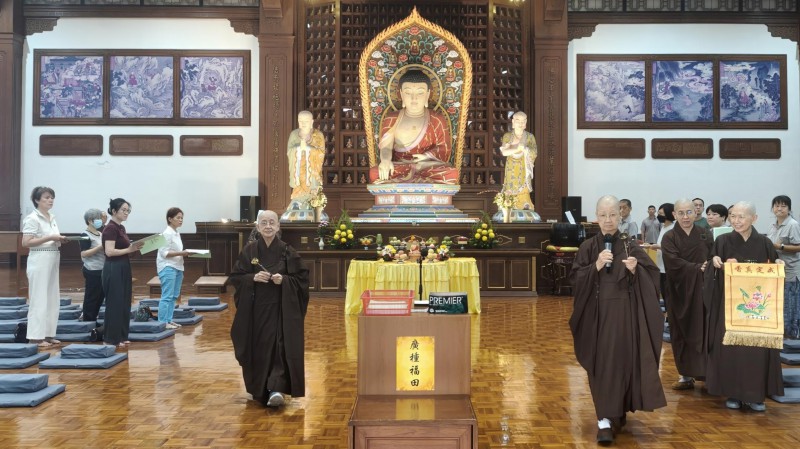 The ceremony concluded with Most Venerable Wei Wu’s compassionate exhortation to the new novice nun: to cultivate the Five Virtues, uphold the precepts, maintain compassion and humility, and guard against negligence. The novice nun replied with reverence: “I will follow the teachings.” The assembly then dedicated merit through chanting and prostrations.