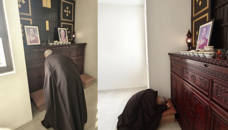 Following this, the repentance segment was conducted. Most Venerable Wei Wu led the novice nun in chanting the repentance verses three times, each line followed by a prostration, expressing sincere remorse for past misdeeds and vowing to cultivate diligently.