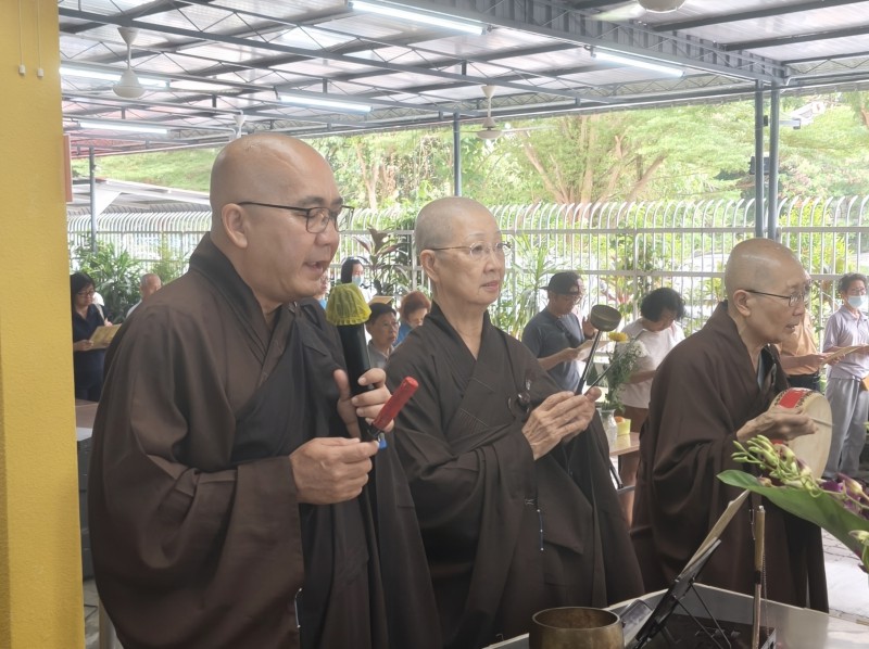 After the Noon Offering session concluded, the Sanghas led everyone to the “San Sheng Dian" for the dedication of merits, sincerely wishing that ancestors may be reborn into good realms and attain