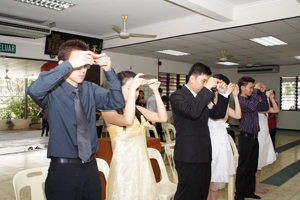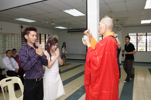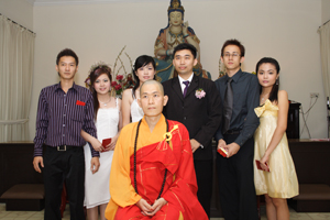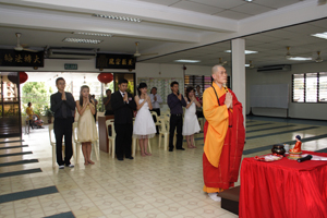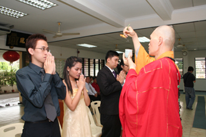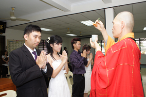 3对新人苏进雄与彭美凤、吴广胜与林旭梅、庄毓凡与苏育莹于今早在檀香寺,接受祝福,并由真如法师代表唯悟法师开示,虽简单却不失庄严的佛化婚礼祝福仪式。