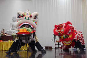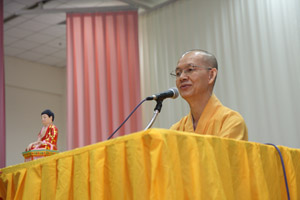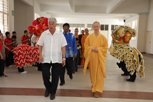 当天,由菩提国中武术团学生为大众呈现祥狮献瑞。同学们舞狮英姿非凡、鼓声震天,让人感受到祥狮的威武。檀香寺住持唯悟法师在会上为大众慈悲开示。师父表示2010年是菩提建校至今第70周年,菩提学校前身是菩提学院。今天大家欢聚在菩提中学是一种缘分,因此,唯悟法师与大家分享菩提学院的创办人——芳莲法师。