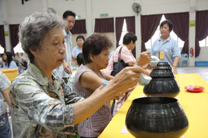 紧接下来是恭请各位斋僧的会首及副会首献灯,同时邀请槟州首席部长林冠英代表黄汉伟行政议员一起参与献灯仪式。接着,由南传法师诵经及由北传法师诵念《盂兰盆经》和「佛前大供」;供僧仪式正式开始。中午十二时三十分,大众供养果仪予诸位法师们;僧众用餐结束后,洪福寺住持文建长老以华语为信众们作简短的开示, 南传法师Ven. Boontam 则以英文作简短的开示。