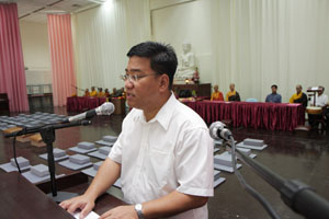 早上七时半,信众陆续抵达“菩提国民型中学”大礼堂参与供僧仪式;十时正菩提中学六楼大礼堂已经聚满了欲参加此殊胜【斋僧育僧大会】的群众。首先,全体信众们肃立合掌迎接法师们莅临;接下来由槟城首席部长林冠英的代表槟州行政议员黄汉伟致词。槟州行政议员在致词中表示:“佛法净化人心,起着道德的作用;佛法让大家远离罪恶。在生活上,我们身在不同的岗位,其实也是一种修行。透过生活生的岗位而修行,把佛法融入生活当中。”YB黄汉伟还表示“斋僧育僧是非常重要的活动,我们要借此活动向各位僧人致敬。”最后,YB黄汉伟祝福各位信众法喜充满,福慧双修。