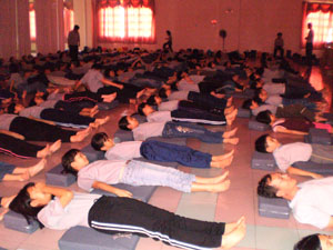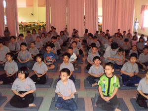 午斋过后是经行,12点半至1时则是大休息。德川老师安排小菩萨们各自躺在舒适的位置上,把小头放在蒲团上,双脚平直,双手舒适地摆放在身体的两侧,双眼紧紧闭上观呼吸,在柔和音乐的播放中,肚子跟着呼吸而上下游动,此时身体是紧贴着地上,身体每一寸肌肤、每一个细胞,四肢和器官都放轻松。当吸着气时,老师要小菩萨们以善意的微笑安抚着身体的每个器官,当呼出气时则要以感恩的心和爱心感受它们的陪同与存在。小菩萨们要感恩自己的双脚在无数个日子里陪他们上学、放学、打球、游泳、运动、跑步、爬楼梯,而他们的双手则帮助他们,让他们可以写字、画画、吃东西、扫地、绑鞋带、打电脑,同时也多感恩双眼让他们每日醒来可以看到可爱的早晨、日出和日落,也可以让他们看到蓝天和白云、大海和船只、雨后的绚丽彩虹、绿油油的草地和大树和五颜六色的花朵!德川老师也要小菩萨们把心中的不快乐和考试的压力全呼出来,然后把身子坐正起来,慢慢地睁开眼睛,吸一口清新的空气,迎接另一个新的开始!念佛半日修终于圆满结束了,而有一小部分同学则要赶着去赴另一场考试---“世界和平道德联考”,小菩萨们学习的精神可嘉。