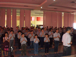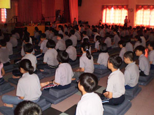 去年得到家长、爱心家族、檀青及学员们的鼎力支持及回馈,今年佛学班再次举办念佛半日修,并已在2010年6月27日于五楼礼堂举行,参加者共有百多位。还没有开始念佛前,永华爸爸为小菩萨们讲解念佛半日修的活动流程及一些礼佛行仪,大部分学员都能掌握自如。