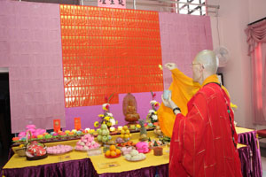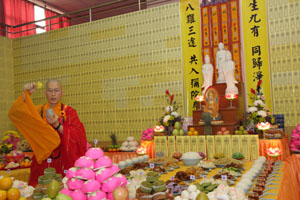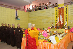 举办【孝亲法会】目的,在于提倡佛教“盂兰盆节”孝亲度王的慈悲精神,并积极发扬华人慎终追远及知恩报恩的美德。当天早上9点30分,事先举行「洒净仪式」。主法和尚手持净瓶云:“菩萨柳头甘露水,能令一滴遍十方。腥膻垢秽尽蠲除,令此坛场悉清净。”大众即随法师们诵念大悲咒,场面显得庄严肃穆。开坛洒净后,即进入「念佛共修」环节,接着是「佛前大供」。大众享用午餐后,下午1时《三时系念佛事》正式开始。