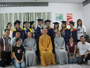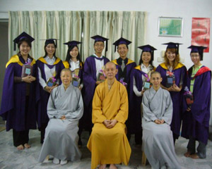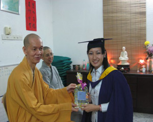 过后,师父分发纪念品予毕业生们。当然还有毕业生们也不忘披上毕业袍,与师父及诸位法师合照。茶会就在轻松且温馨的气氛下结束。感恩促成毕业茶会的所有因缘。