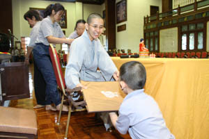 檀香周日佛学班2010 年结业典礼经已在11月14日(星期日)于檀香六楼大雄殿举行,当天学员们也受持福智十善法,授戒和尚为真如师父。师父、爱心家族、家长及学员们济济一堂,场面很庄严和充满喜悦。首先是唱诵炉香赞和大悲咒,过后是洒净仪式。师父在开示之前先带领学员们三称 [南无本师释迦牟尼佛 ] 圣号,因为佛陀传授真理给我们,是我们学习的导师。