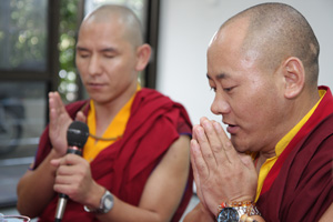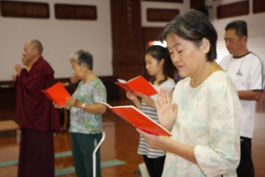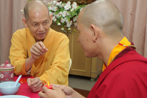 过后,檀香寺常住法师、已故敦林的家属以及檀香寺职员一起聚集在斋堂用斋。檀香寺住持和尚唯悟法师,在饭后开示时指出:佛陀在未成道前,曾修六年的苦行,日食一麦,身体骨瘦如柴。后来,他发现修行要走中道,在放弃修苦行时,到尼连禅河沐浴,又接受牧羊女苏耶妲(SUJATA)的乳糜供养,才恢复了体力。之后,悉逹多太子到菩提伽耶的菩提树下金刚座上端身正坐,立下誓言:“若不成正觉,誓不起此座”。最后,他在农历十二月初八凌晨,夜覩明星而成道,号称"释迦牟尼佛"。
