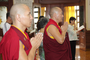 今天适逢已故我国政坛元老,前槟州首席部长敦林苍佑医生往生后的第四十九天,檀香寺在大愿殿为敦林设立临时的往生牌位,其家属以斋饭素菜鲜花水果,一起前来参与佛前大供,随着法师们的梵呗声诵经回向,祈愿阿弥陀佛接引敦林往生西方。