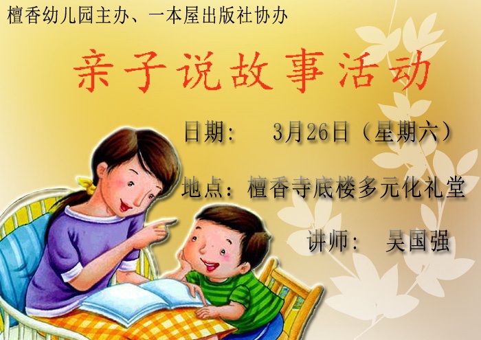 为提高父母对幼儿读物的选择与认识,并提升父母说故事技巧,檀香幼儿园将于2011年3月26日(星期六)上午8时半,在檀香寺底搂多元化礼堂主办《亲子说故事》培训班。此活动特邀请吴国强硕士前来主讲,欢迎为人父母或幼教工作者积极参加。