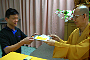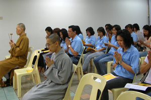 在受持十善法仪式结束前,师父颁发受持十善法卡片给老师和家长代表。最后大家合掌,在师父的带领下回向功德。这个简单而庄严的仪式就此结束。