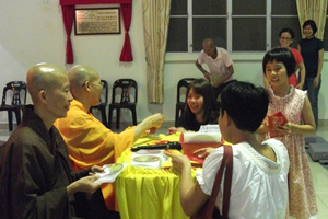 年初一早上约十一时,众佛友们已齐聚檀香净苑佛殿,法喜迎接新的一年。 共修会以唱诵炉香赞开始,接着三称增福寿菩萨摩诃萨,南无消灾延寿药师佛,再念药师灌顶真言七遍并回向佛光注照,灾星退度福星临, 运限和平, 福寿永康宁!