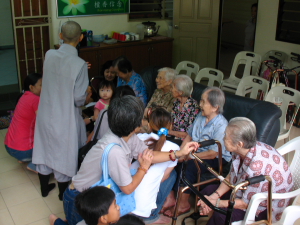 抵达目的地 —— 新港晚晴苑后,招坤师兄便为我们大略讲解该苑的近况。他说由于当天是周日,所以有些老菩萨已经跟着他们的家人回家去享受天伦之乐。除此之外,师兄也解释说办晚晴苑的宗旨不是为了鼓励更多的年轻人将他们家中的老菩萨送到晚晴院后就置之不理,事实上本苑只是暂时代劳,看顾老菩萨的起居饮食;进而减少他们由于单独在家而可能发生的一些意外。晚晴苑里的一些老菩萨偶尔也会偷偷的哭泣,这意味着他们其实是很想念他们的亲人。