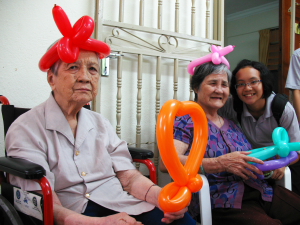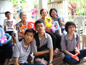 在第二个互动环节里,青年团团康组组长 —— 志春师兄带领学生们制作心形的爱心气球。制作心形的小丑气球其实并不困难,只要逐步的跟着步骤做就可以完成了。学生们小心翼翼的扭曲气球,家长们也在一旁参与。老菩萨们见到孙子们犹如在玩气球似的也乐透了,场面顿时温馨洋溢。爱心气球完成后,学生们就把爱心气球一一的献给了老菩萨,为老菩萨在这周末的星期天添上了不少的欢乐与喜悦。