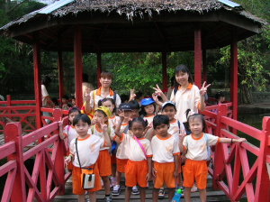 当天早上,天气晴朗,大家都穿着整齐的运动衣准时集合在檀香寺食堂。小朋友们都背着自己的小背包,满心期待这次的郊游。各班级任老师帮小朋友点名之后,就带领小朋友们到大悲殿礼佛,然后大家就开开心心地乘巴士出发了。小朋友们在巴士上唱着歌,吃着老师为他们准备的早餐,不一会儿,就抵达目的地了。