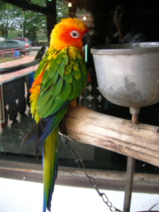 值得一提的是那里有很多鹦鹉,它们的羽毛五颜六色,不但漂亮,还会学人说话,小朋友们都乐意亲近。