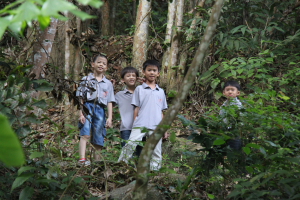 长长、曲折、略为陡峭的山路两边,抬头望去尽是各式各样的热带水果:榴莲、豆蔻、红毛丹、香蕉等;一路走一路抬头仰望着熟的、生的水果时,善意提醒来了:别忘了注意山路,脚步别错过山路拐弯处。感恩“收摄心念”的提策。脚步稳,所学的才会稳。路边偶尔会有一些水果掉下,然而路旁不时出现的“不要采水果”的告示板,在在提醒我们“不偷盗”,即便是掉下的水果,因为这些都是私人果园。山路略为陡峭时,自然是低头走的,俯视所见的也是种种的昆虫蚁类:蚊子、苍蝇、蚂蚁,马陆;都是肥肥、大大只的,但偶然间却见一只小小的蛇横过我们。有菩萨惊叫起来,这下可把小蛇给吓到了。小蛇即刻静止不动,好像是在观望似的。好心的行人菩萨指示我们从旁边走过,不要踩到小生命。谢谢菩萨“不杀生”的提策。