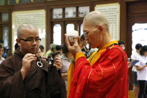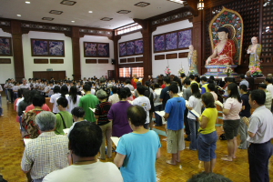 2011年8月14日(农历七月十五),檀香寺一如往年的举行《佛说盂兰盆经》共修法会。上午十点半,大众齐聚六楼大雄殿。监院真如法师担任中尊,首先向大众讲解‘盂兰盆’的意义,并依照本寺住持唯悟法师以前的开示,教导大众在诵经共修前,了解‘前行’、‘正行’与 ‘结行’的正思惟或观想。