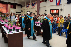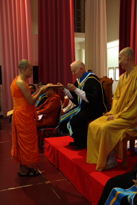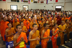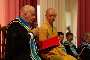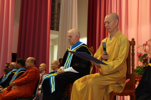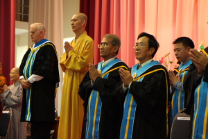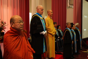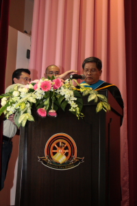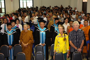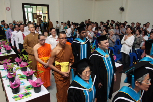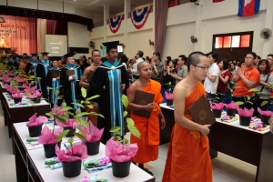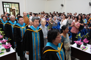 由槟城檀香寺住持唯悟法师推动和建立于泰国的国际佛教大学,8月31日在泰南康月镇的总校大礼堂内举行第四届毕业典礼。当天共有大约五百人出席该项盛会,分享毕业学子的喜悦,也同时见证了充满意义的“千树一心护佛大”植树仪式。出席者除了大学董事会成员、教职员、应届毕业生与在籍学生外,也包括来自马来西亚的佛友及不少泰国当地居民与毕业生的家人和亲友等。本届共有二十八名佛学硕士、五名佛学学士、五名高级佛学文凭结业生,及九名其它文凭结业生。