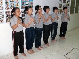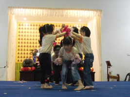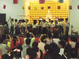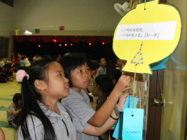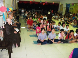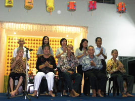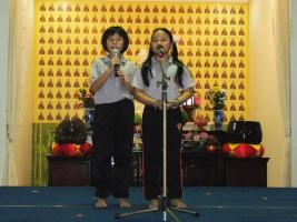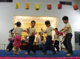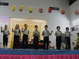 紧接着下来是余兴节目,由檀香净苑各单位呈献:首先檀香幼儿园6岁小菩萨以轻快的《摇摇摆摆》 舞步牵动观众的心;周五佛学班的喜儿与颖燕同学以诗歌朗诵方式赞颂《我的妈妈》;晚晴苑老菩萨、护士及员工一曲《老实念佛人》带动全场进入高潮,掌声随着音乐的节拍,此起彼落,是那么的和谐与安乐;周五佛学班一群同学以手语表达《心中的声音》及《妈妈宝贝》;余兴节目的尾声, 由可爱的幼儿园小菩萨提着纸灯笼,跟着《月亮圆》的歌声舞出了中秋佳节提灯笼的快乐气氛。